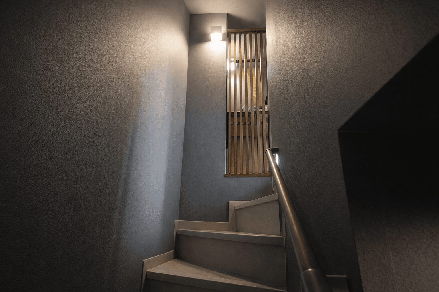 縦のラインが美しい木製格子や、視線を誘導する階段構成が、限られた面積の中に豊かな表情を演出。