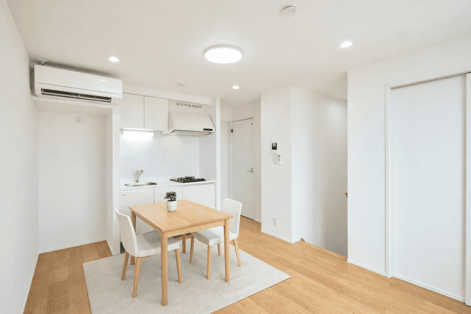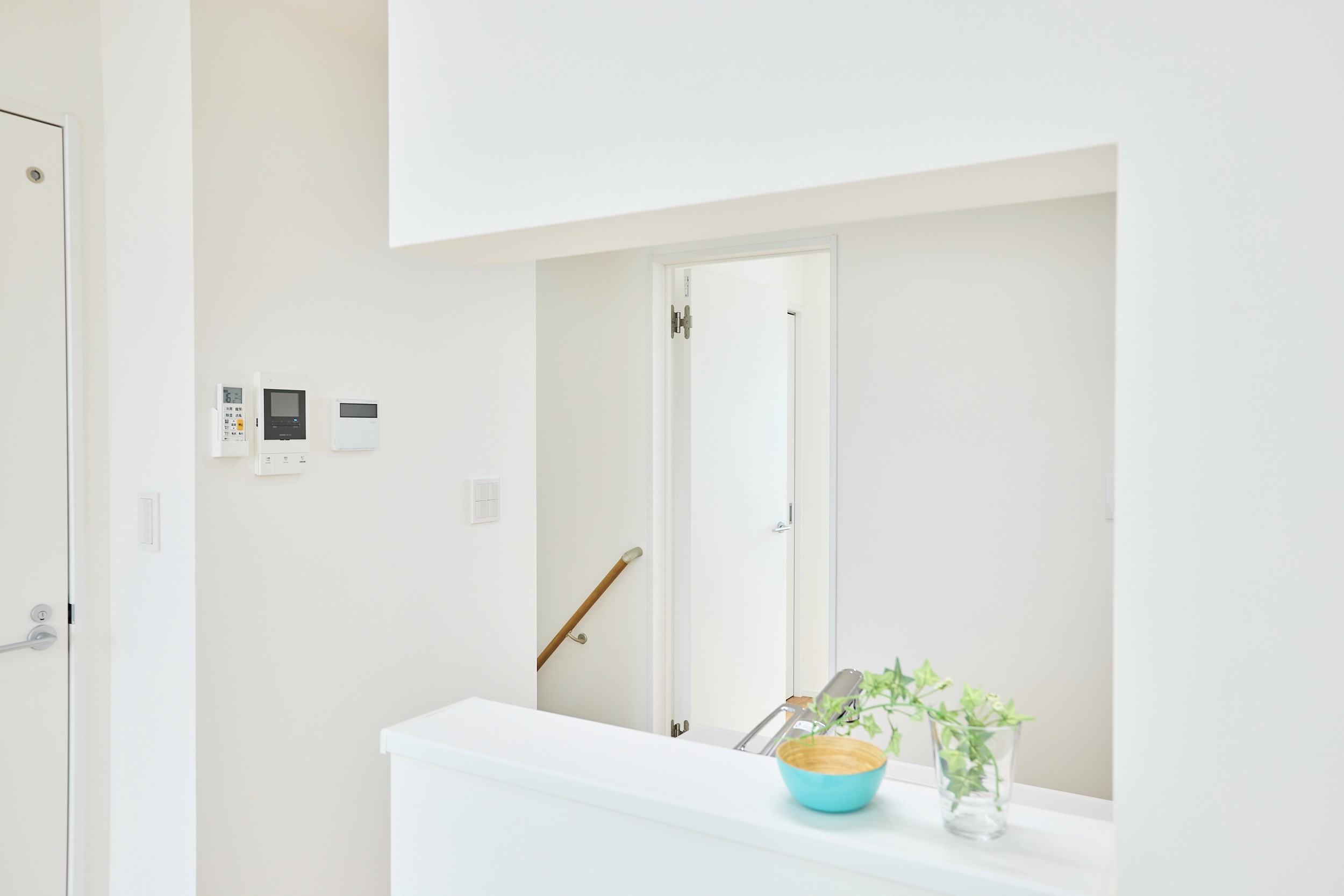 内観は白と木の質感を対比させ、光の移ろいを際立たせる仕上げとしています。